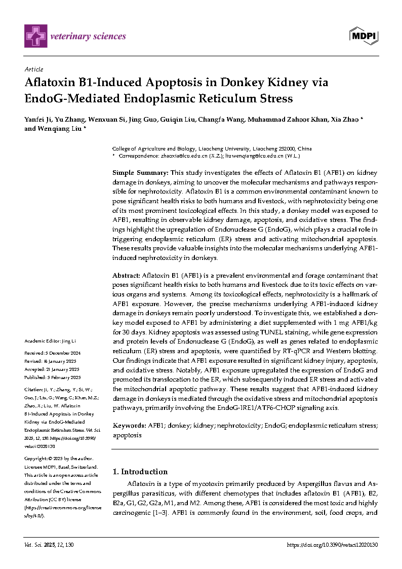 公司2022级动物学专业研究生纪言霏在《Veternary Science》杂志上发表了题为“Aflatoxin B1-Induced Apoptosis in Donkey Kidney via EndoG-Mediated Endoplasmic Reticulum Stress”的研究论文,指导教师为刘文强教授、赵霞博士。