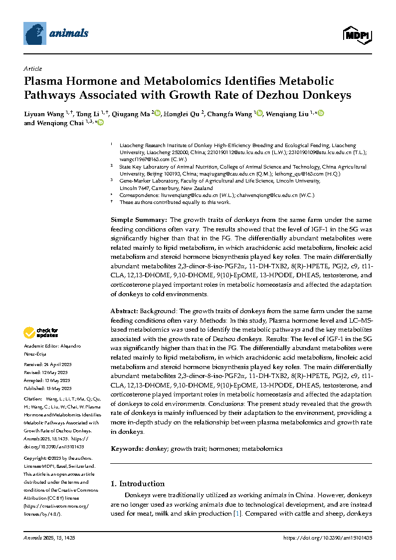 公司2022级动物学专业研究生王莉源在《Animals》杂志上发表了题为“Plasma Hormone and Metabolomics Identifies Metabolic Pathways Associated with Growth Rate of Dezhou Donkeys”的研究论文,指导教师为刘文强教授、柴文琼副教授。