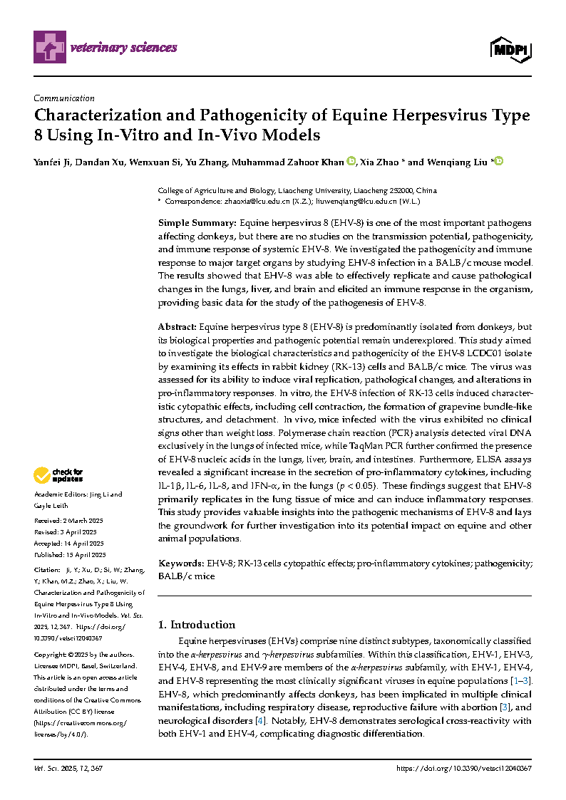 公司2022级动物学专业研究生纪言霏在《Veternary Science》杂志上发表了题为“Characterization and Pathogenicity of Equine Herpesvirus Type 8 Using In-Vitro and In-Vivo Models”的研究论文,指导教师为刘文强教授、赵霞博士。