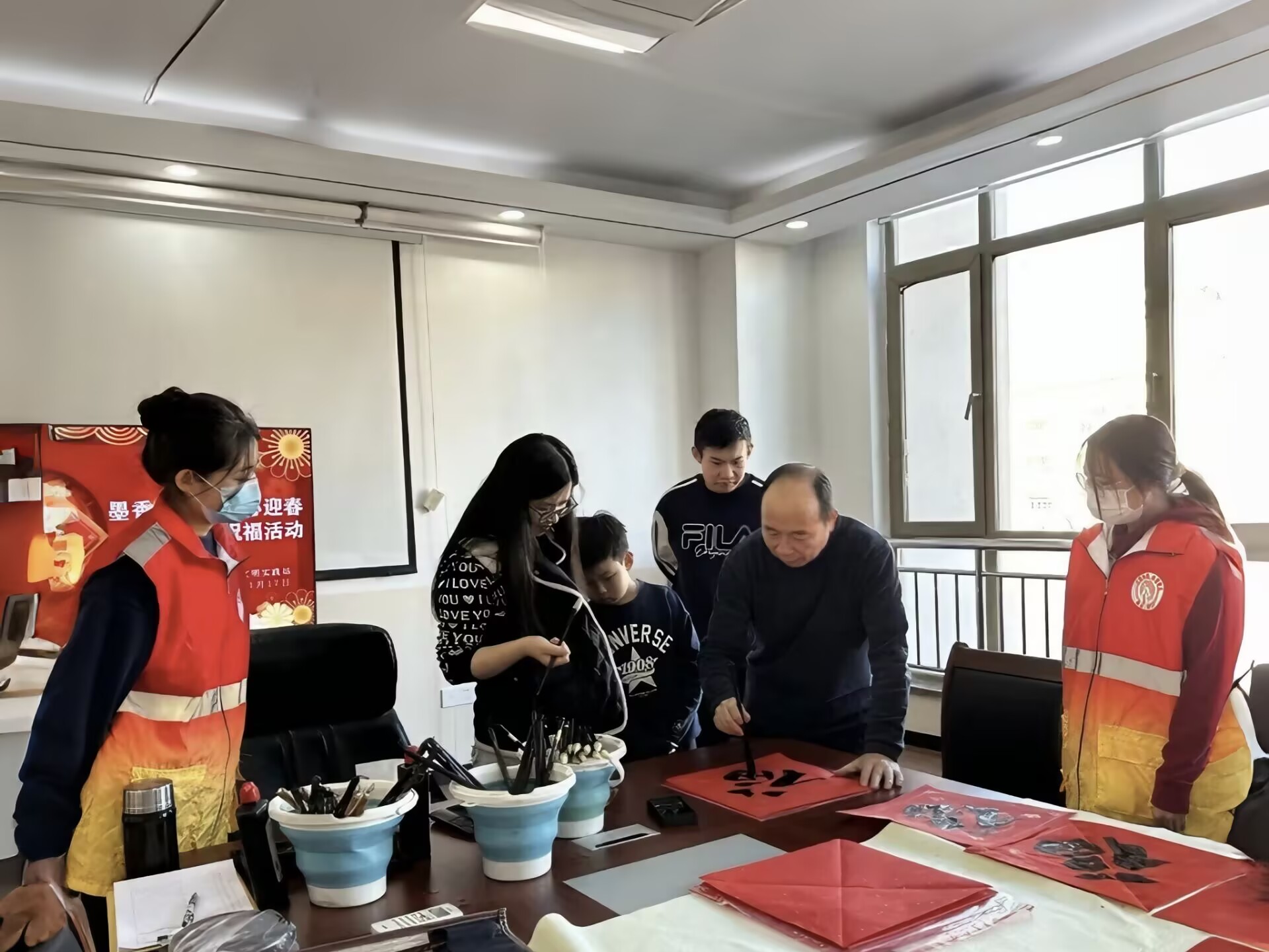 活动开始,书法爱好者向志愿者细致讲解了写春联的要点并亲身示范,包括内容选择需贴合节日氛围、表达美好祝愿,格式规范要遵循对仗工整、平仄协调的原则。志愿者们认真观摩后,纷纷拿起毛笔,在老师的悉心指导下,反复练习并逐渐掌握书写技巧,完成几副饱含新春祝福的作品。