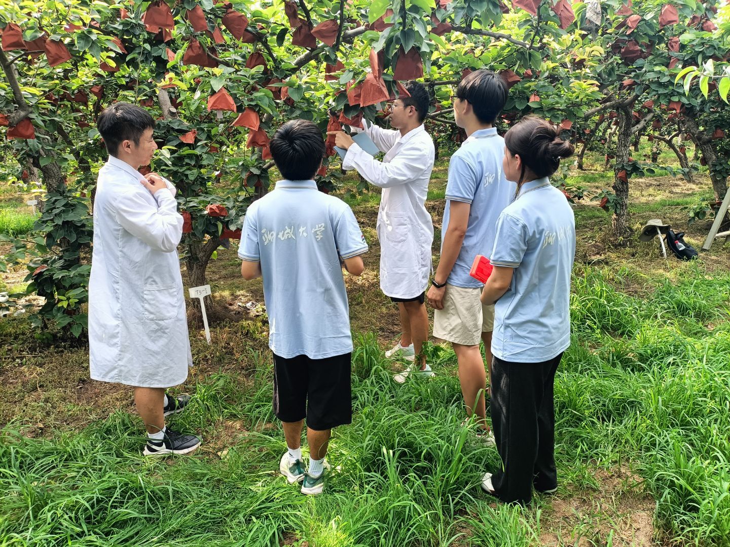 团队成员深入北崔村核心种植区,通过结构化问卷,广泛收集梨农第一手资料,并基于问卷初步分析,开展了“沉浸式”产业研习,在科技小院研究生指导下,团队进行了实地观察,对比采用“小院配方肥”与常规施肥梨树的差异——前者叶片肥厚浓绿、挂果均匀,彰显科技增效潜力。不仅实地观察黄金梨种植规模、树势长势,直观感受科技小院技术落地的实际场景,还参与了田间观察或技术试验,深化了对黄金梨标准化种植技术需求的理解。