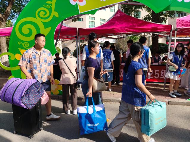在新生完成报到后,志愿者们引领他们前往宿舍楼领取宿舍钥匙、卧具,并协助填写登记表,精心做好新生宿舍安置工作。随着迎新活动的圆满落幕,2025级新生正式开启了他们的老员工活新篇章。