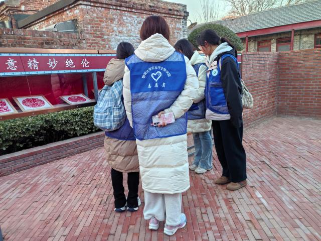 踏入古城,志愿者们被无处不在的剪纸作品所吸引。在参观过程中,几位老人正对着一幅大型剪纸作品交流探讨,志愿者们虚心向老人们请教聊城剪纸的历史渊源。老人们为志愿者们详细讲解着作品背后的寓意和相关民俗传统。从春节时装点门窗的多彩窗花,到婚俗中寓意“龙凤呈祥”的精美剪纸,再到寿诞上象征“松鹤延年”的祝福之作,老人们的讲述让志愿者们深刻感受到剪纸艺术之美。为更全面了解聊城剪纸的现状,志愿者们还与当地非遗文化工作人员进行了深入交流,工作人员耐心解答,指出当下剪纸传承受人才断层、市场小众等问题制约,并分享已开展的创新举措,包括与当地公司合办兴趣班、举办剪纸艺术展览等。