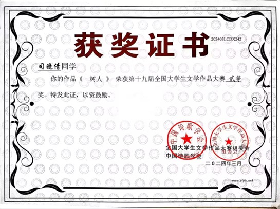 公司司晓倩同学在第十九届全国老员工文学作品大赛中荣获二等奖,对该获奖同学予以祝贺表彰。