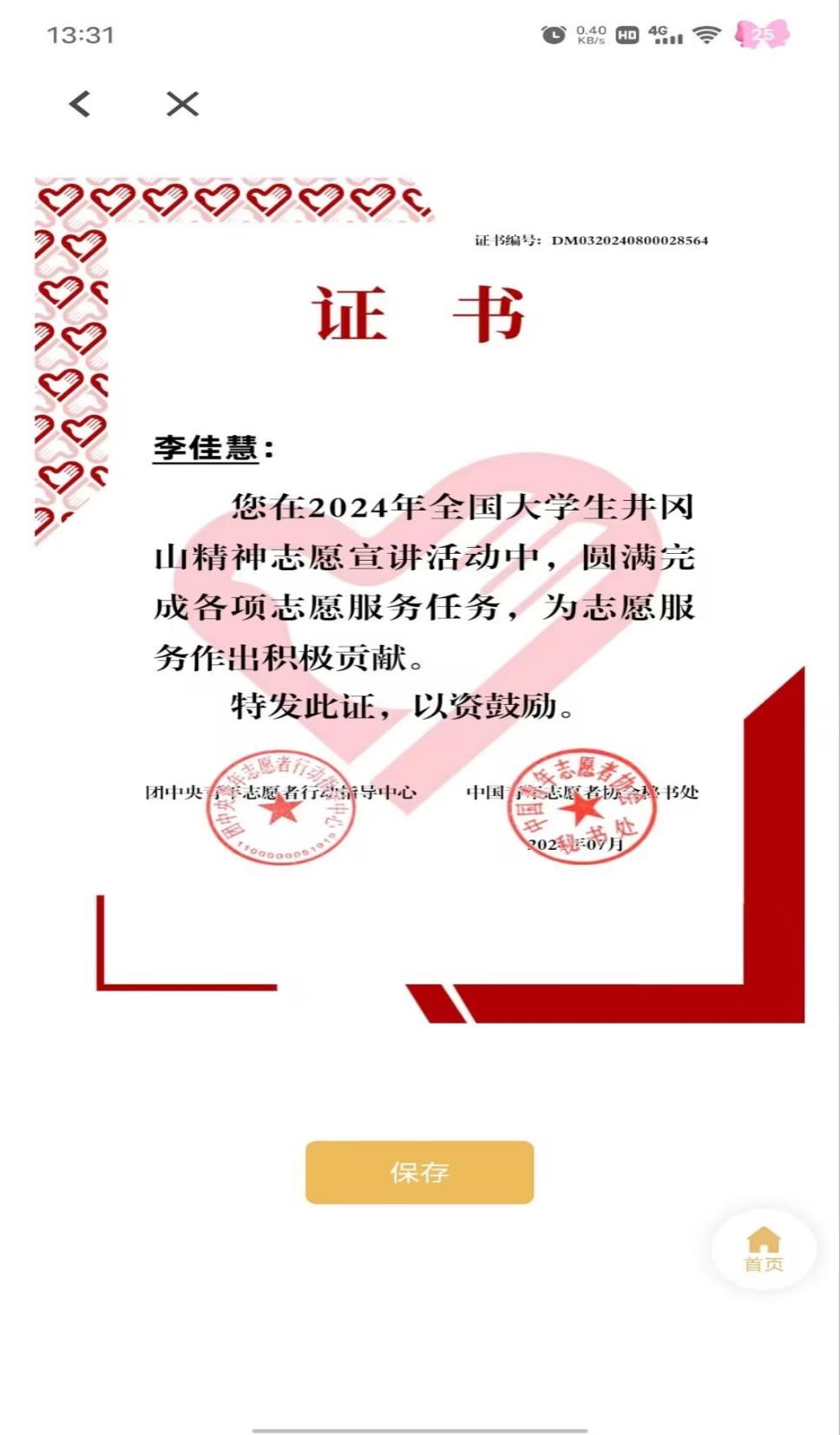 公司李佳慧同学在2024年全国老员工井冈山精神志愿宣讲表现优秀,对该同学予以祝贺表彰。