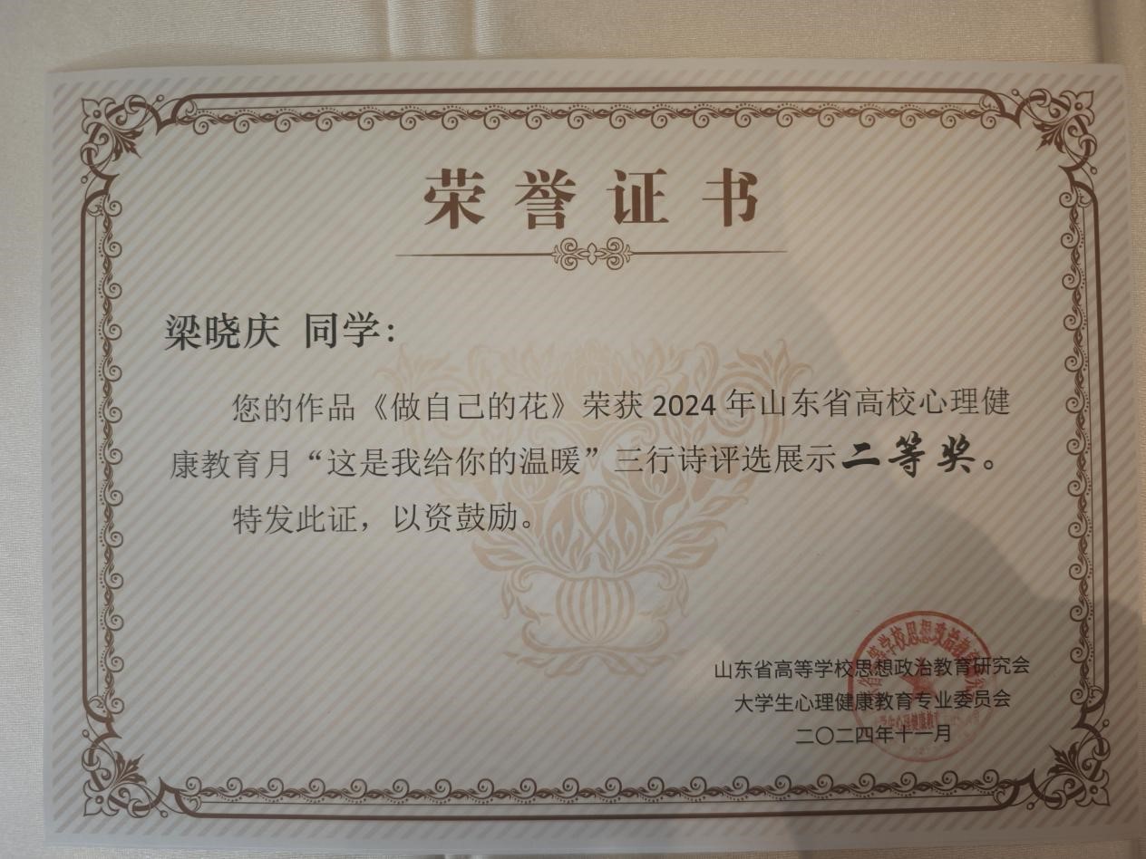 公司梁晓庆同学在2024年山东省高校心理健康教育月“这是我给你的温暖”三行评选展示荣获二等奖,对该获奖同学予以祝贺表彰。