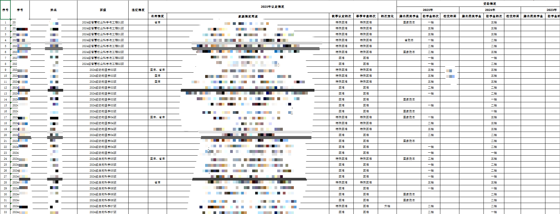 2.学年认定与审核情况:记录员工秋季学期的困难认定结果,以及春季学期的资格复核情况,确保资助资格的动态管理真实有效。